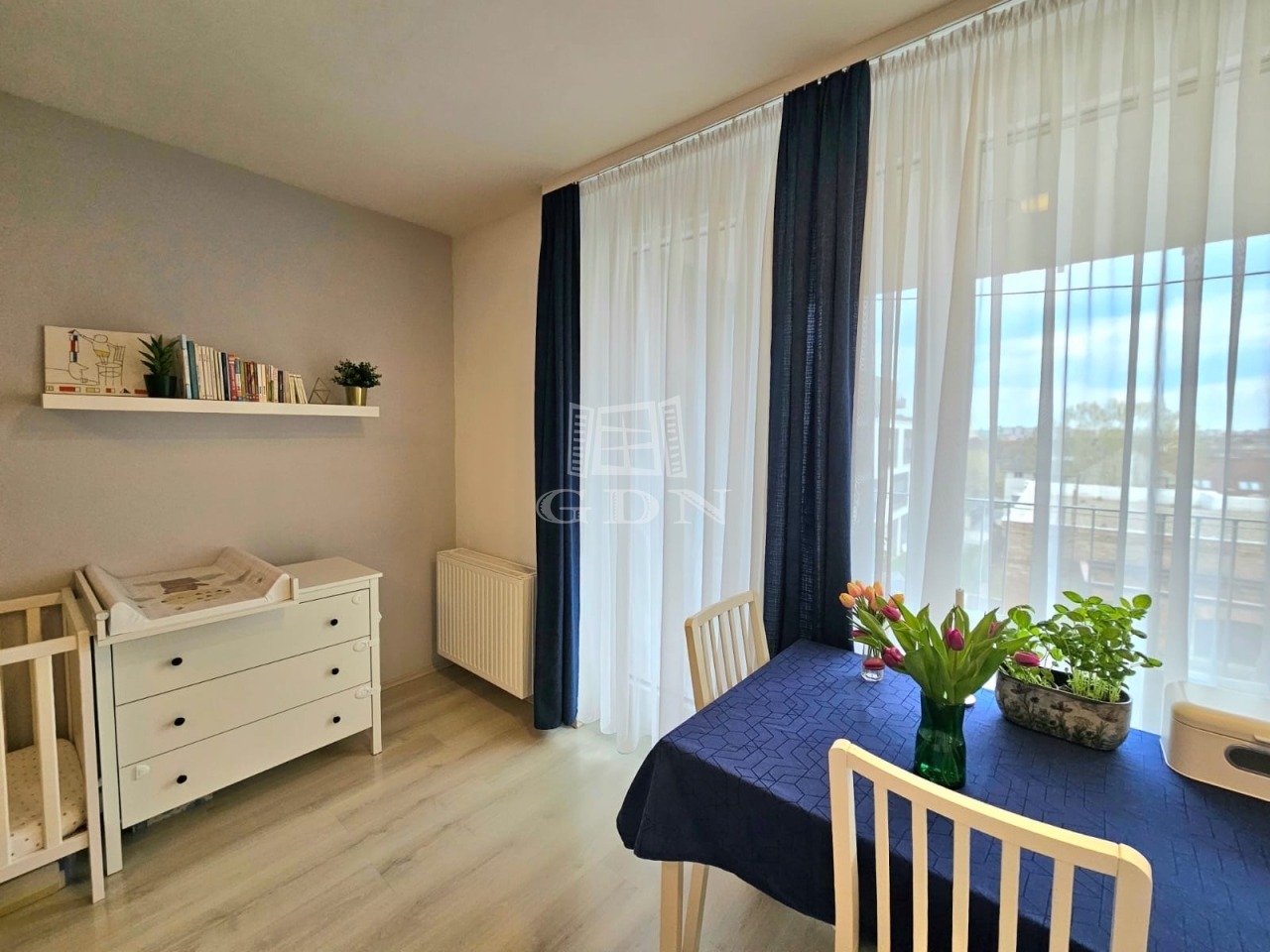 A lakás az 5. emeleten található, keleti tájolásának köszönhetően világos, ugyanakkor kifejezetten csendes, mivel nem a forgalmas Váci út felé néz.