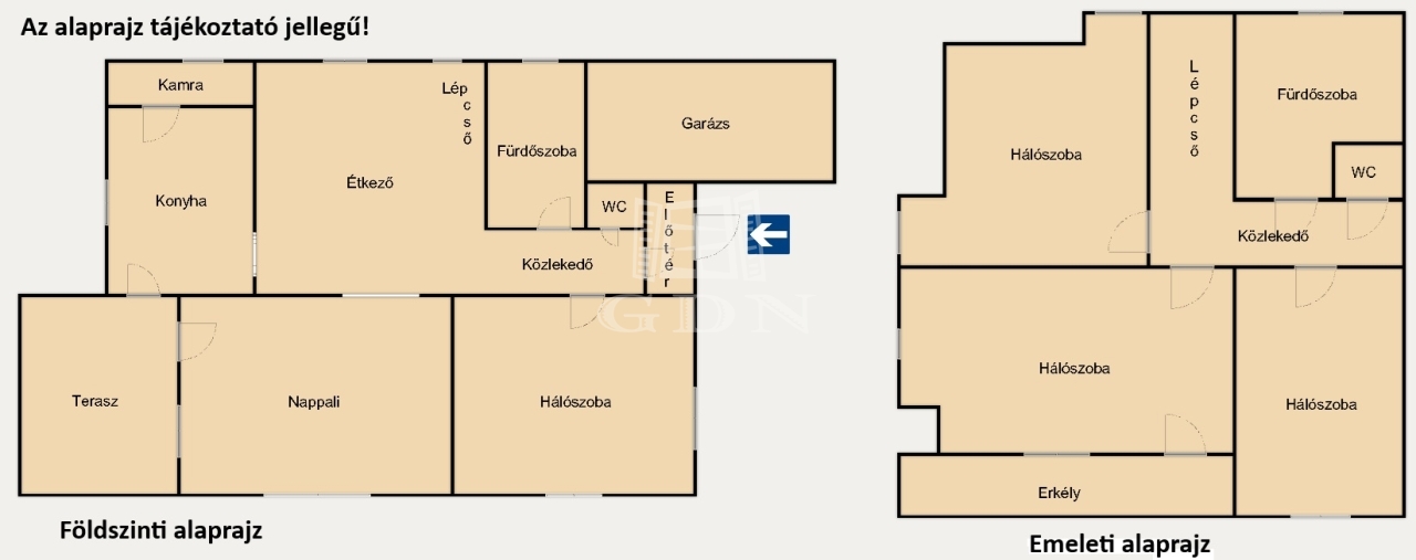 A földszinten, amerikai konyhás nagy étkezős nappali, hálószoba, fürdőszoba, külön wc, közlekedő, terasz , garázs kapott helyet.