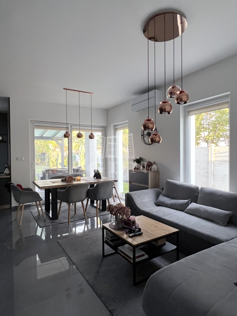 Az épület elrendezése átgondolt és élhető, a földszinten csak a garázsnál érintkezik a szomszéddal, az emeleten pedig mindössze két hálószobánál van a kapcsolódási pont.