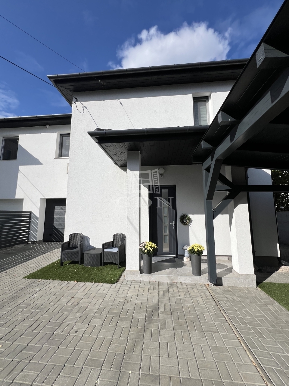 Az előkert teljes területe térkővel burkolt, így a garázson felül további 2 autó számára fedett beállási lehetőség biztosított.
