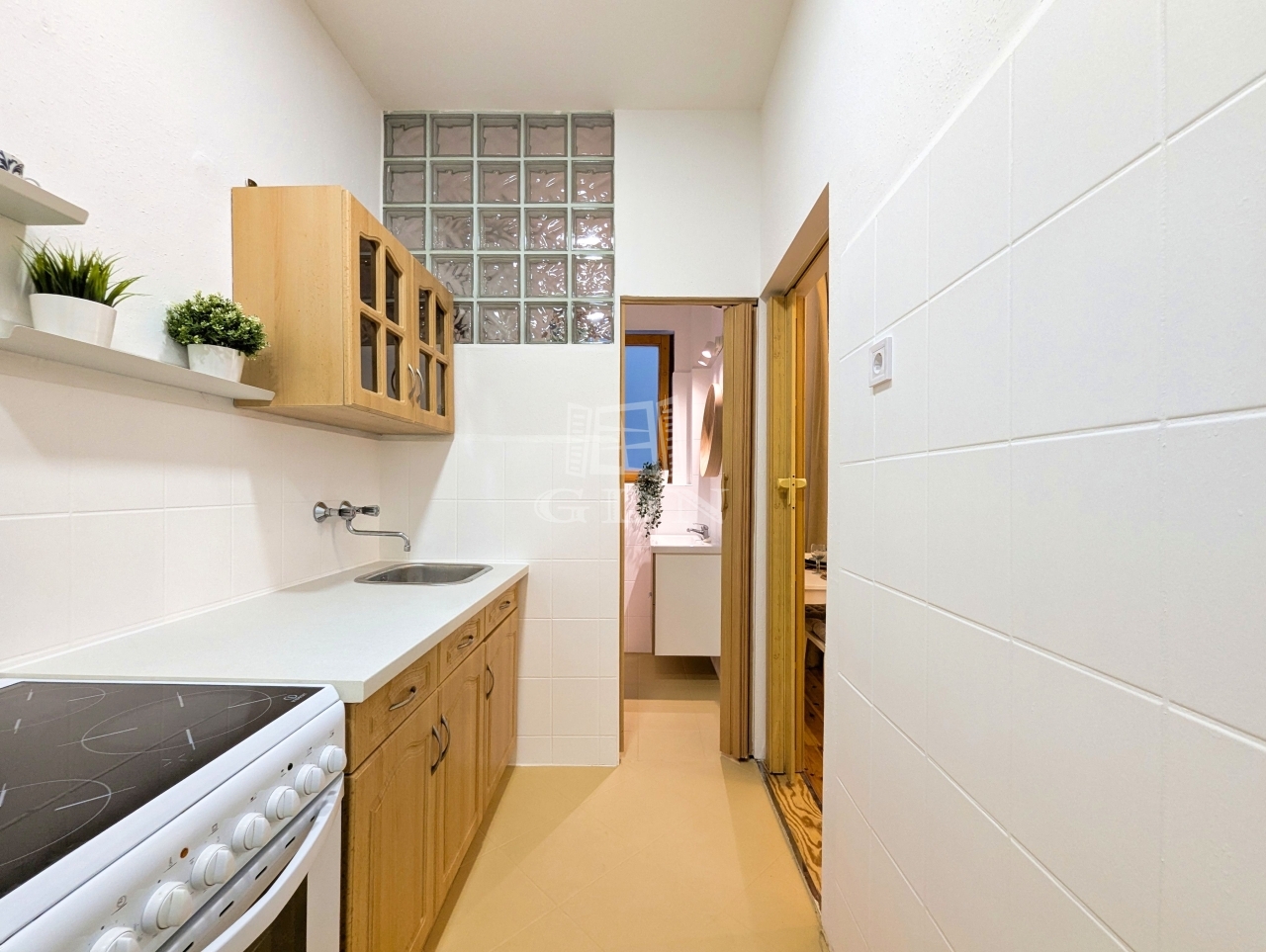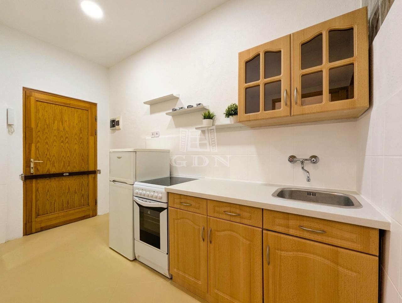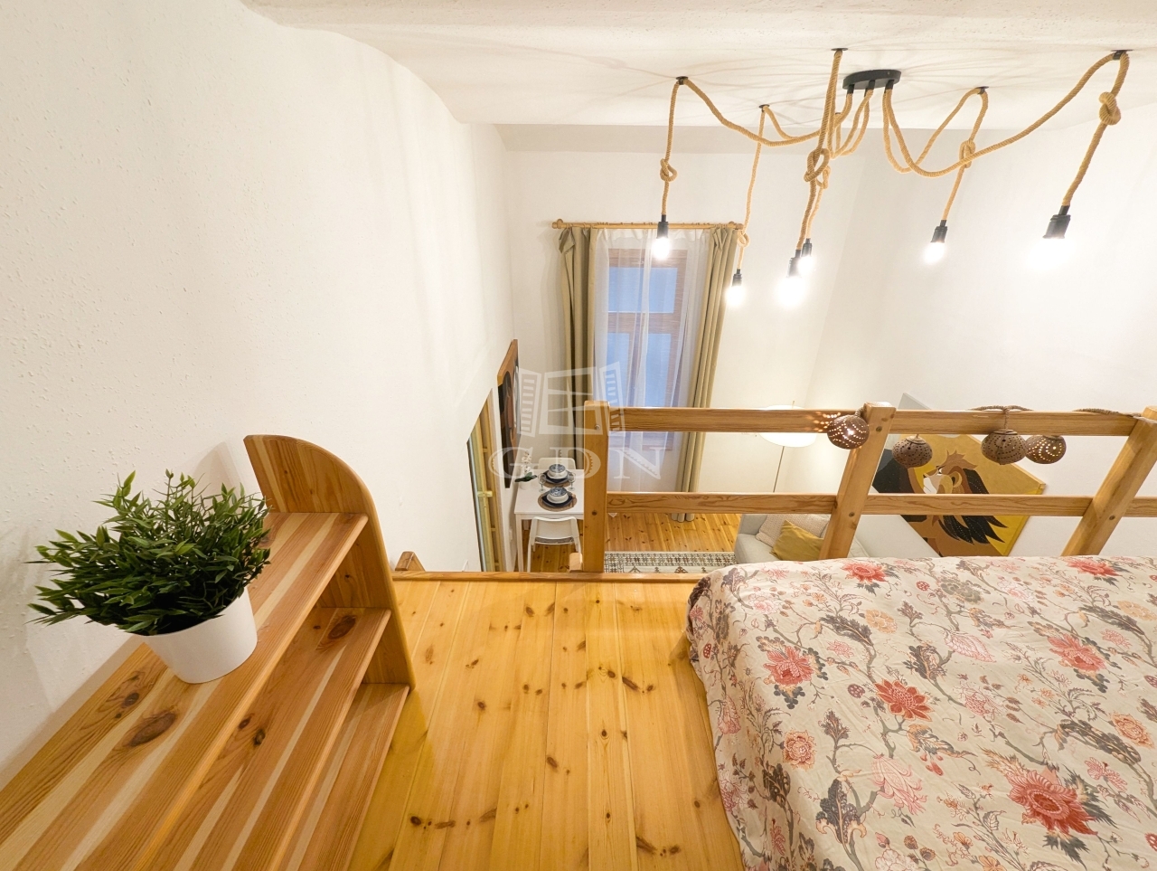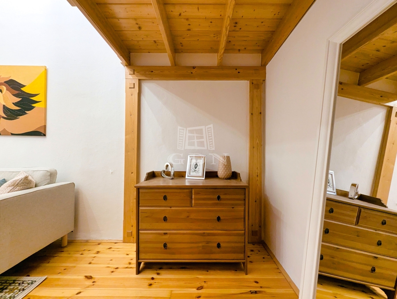 A lakást letisztult fehér falak és meleg tónusú faelemek jellemzik, ablakai nem az utcára néznek, így a lakás rendkívül csendes.