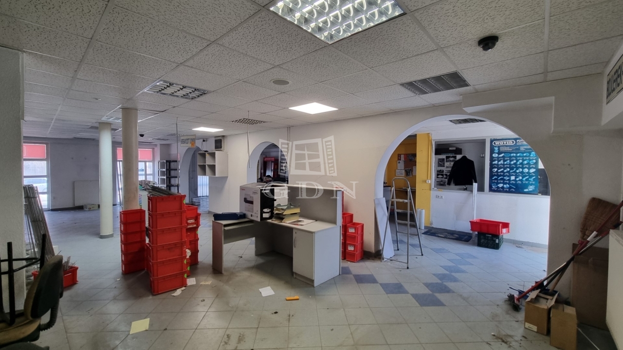 Elosztását tekintve egy egylégterű eladótérből, egy női/férfi mosdóból, egy teakonyhából és egy kis irodából áll.