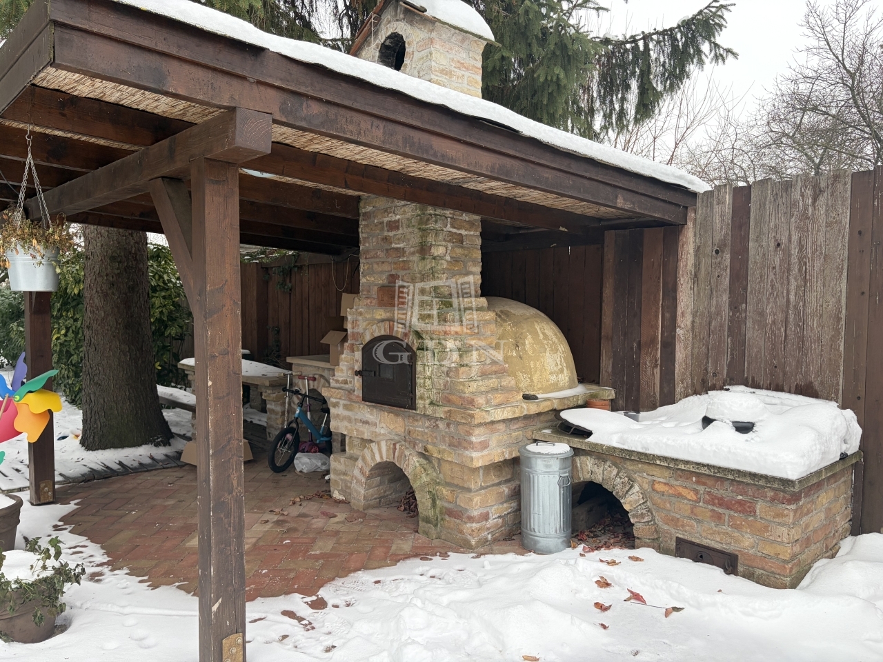 A gondozott nagy méretű kertben levő kerti búbos kemence, és a sütögető kiváló helyszíne a kikapcsolódásnak.
