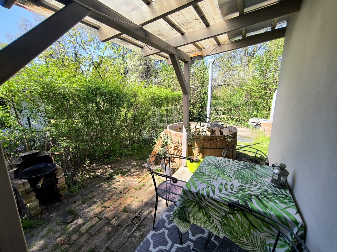 Az alap épület 2020-ban falakig vissza lehet bontva, az L alakú fedett terasz beépítésre került könnyűszerkezettel. Szinte minden 2020-as, a víz (vezetékes) a villany (3x20 A + éjszakai áram, gáz az utcában) a tető lemez fedése stb. Csatorna nincs, nem is lesz. A tégla rész 10 centis dryvitot kapott. Három autó részére fedett beálló lett kialakítva. Fűtés árammal, illetve egy nagy kandallóval megoldott. A földszinten zuhanyzós, az emeleten sarokkádas fürdőszoba. A dézsafürdő a vételár részét képezi. Apróbb elmaradások vannak, gondolok itt a teraszok burkolására a dryvet részek színezésére, stb.