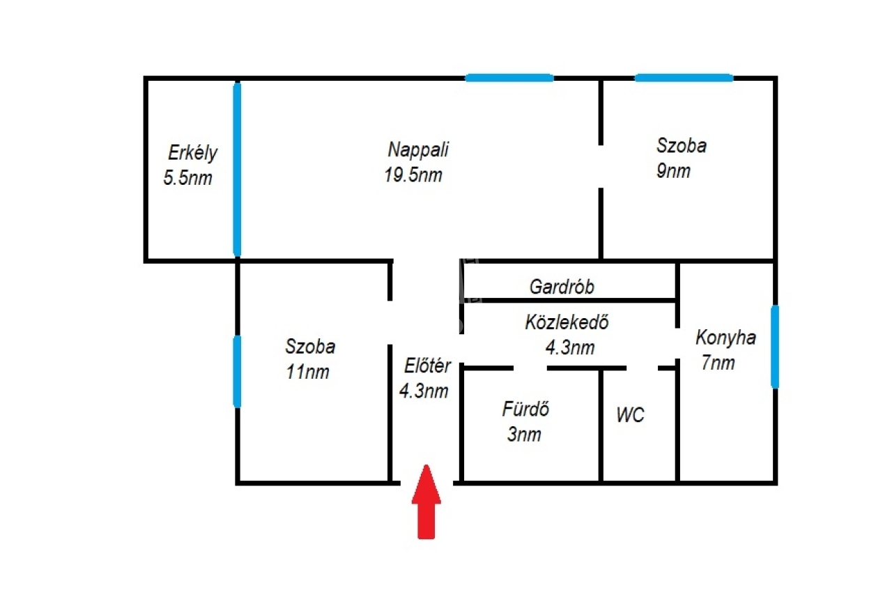 Az előszobában nagy gardróbszekrény, a hálóban falba süllyesztett fa könyvespolc található.