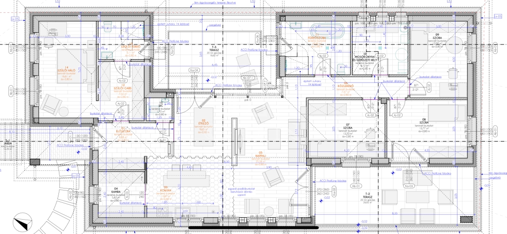 - A homlokzati falak: Porotherm 30 cm N+F téglafal. A belső válaszfalak 10 cm es Porotherm N+F téglából épülnek. A falak felett hőhídmentes (+5cm XPS szigetelés) zsaluzott vasbeton koszorú, a nyílászárók felett előregyártott PTH, vagy monolit vasbeton áthidaló