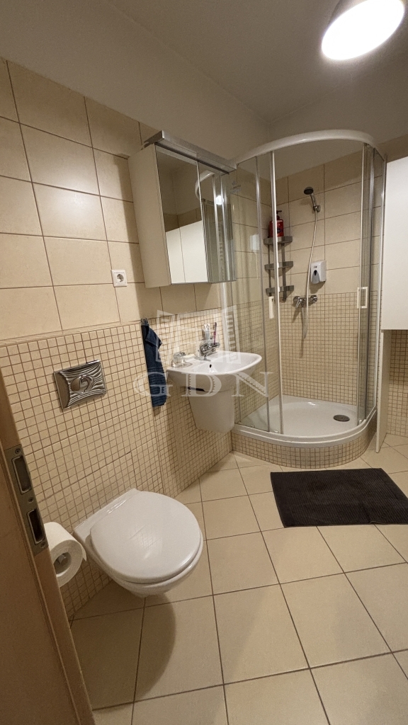 Előszobában előszoba fal, fürdőszobában törölközőszárító, mosdó, vécé, tusoló található.