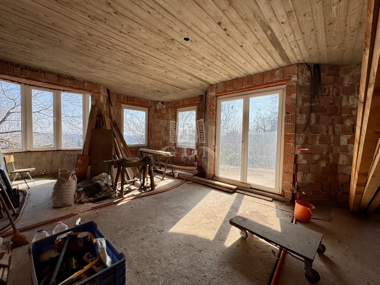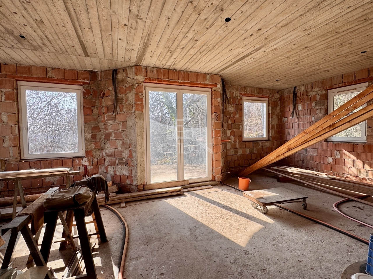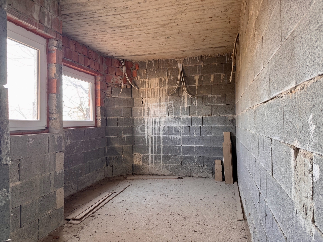 A telken neves építész által tervezett, 4 szintes, szerkezetkész (kb. 70%-ban) ház található.