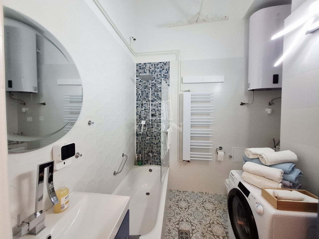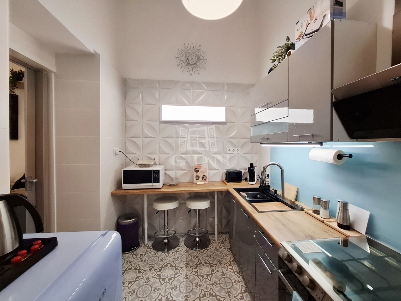 A lakás lakberendező által megtervezett és berendezett, igényes, modern enteriőrrel rendelkezik.