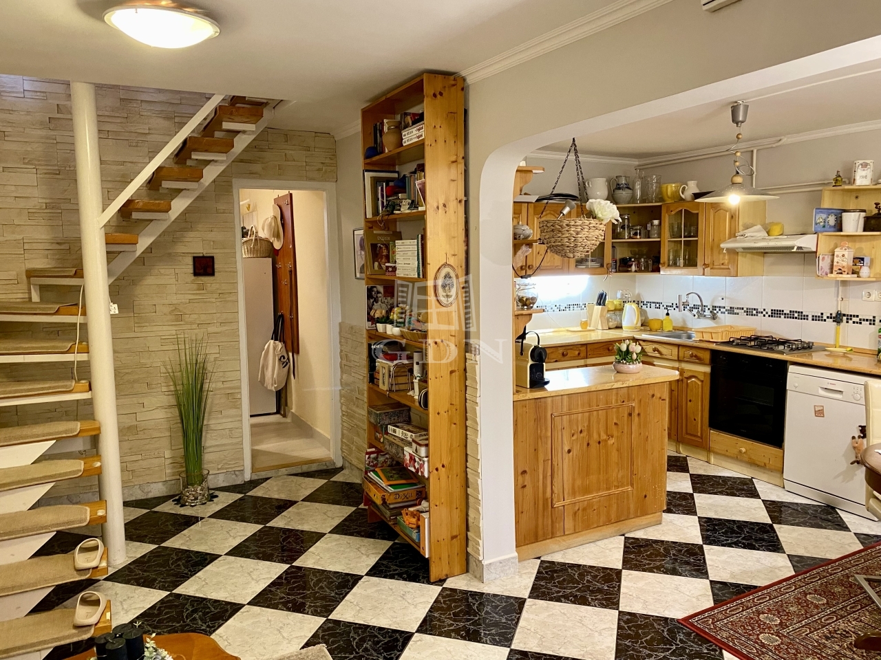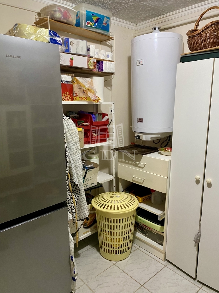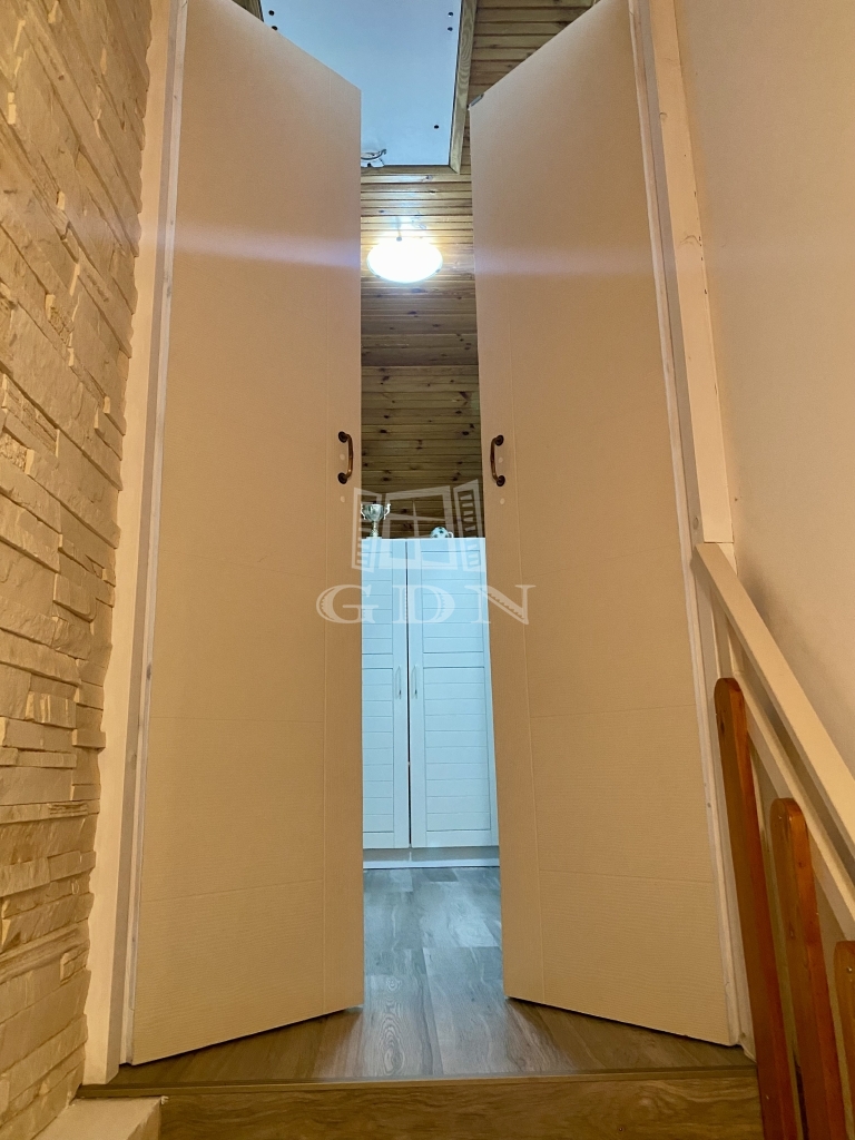 Az épületbe egy tágas, 30 négyzetméteres fedett teraszon keresztül jutunk be, amely már önmagában is tökéletes helyszín a pihenésre vagy családi összejövetelekre. Az alsó szinten a praktikus elrendezés kap hangsúlyt: itt található a beépített konyhabútorral és gáztűzhellyel felszerelt konyha, az étkező, egy kamra, valamint a mosókonyha és az előszoba.
