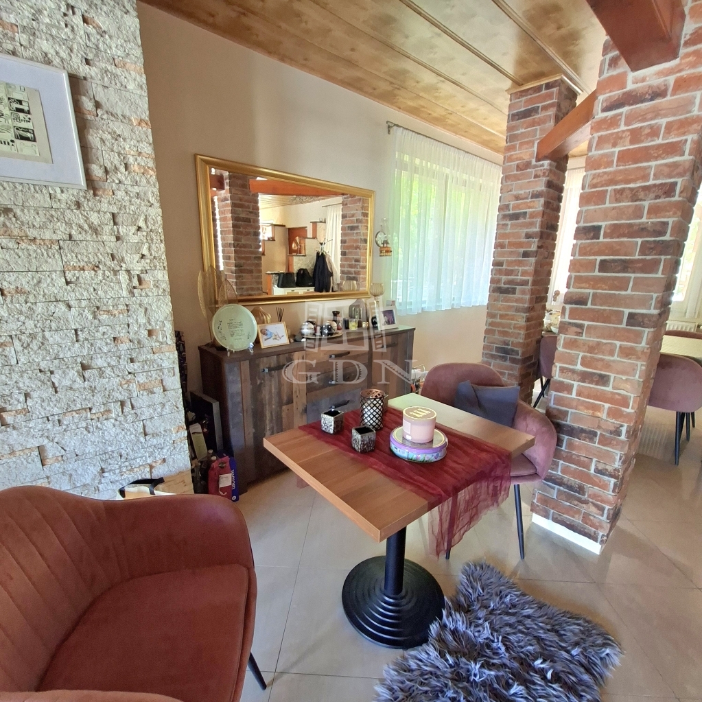 És maga az épület....., a földszinten, ami 84 m2 egy tágas nappali, aminek az udvar felé teljesen üvegezett az oldala, egy nagy étkező, konyha, fürdő és egy tároló található (amit a jelenlegi tulajdonosok vendégszobaként hasznosítanak), a bejárat felől pedig egy fa szerkezetű teraszt alakítottak ki. A tetőtérben, aminek hasznos alapterülete 36 m2, található egy illemhelyiség, fürdő, hálószoba és egy nappali szoba, innen is egy fedett erkélyre jutunk.