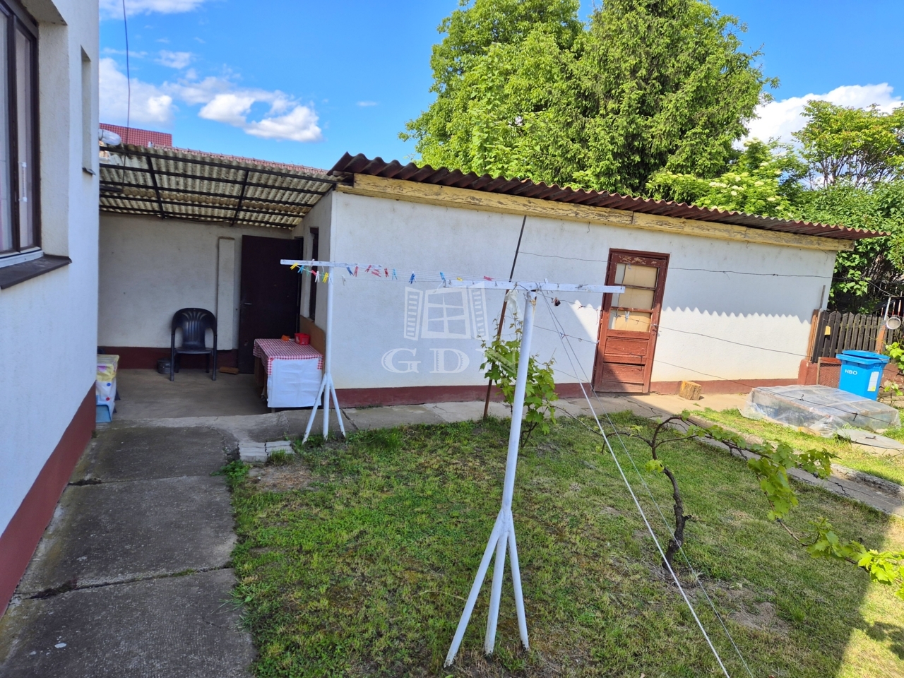 Az épület főbejárata előtt hosszan egy 18nm alapterületű nyitott terasz található, mely szükség esetén beépíthető. A garázs jó állapotú külön utcai bejárat van hozzá készítve. A hátsó udvarra a másik utcáról autóbeálló út vezet, több autóval is be lehet állni. A telken nem csak a háziállatok számára van külön zárt udvar, hanem még egy kisebb méretű gyümölcsös és konyhakert is rendelkezésre áll.