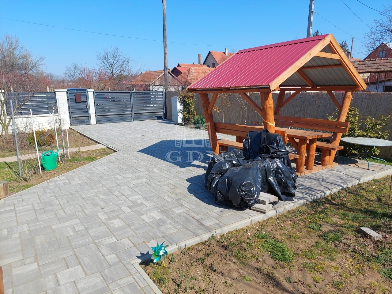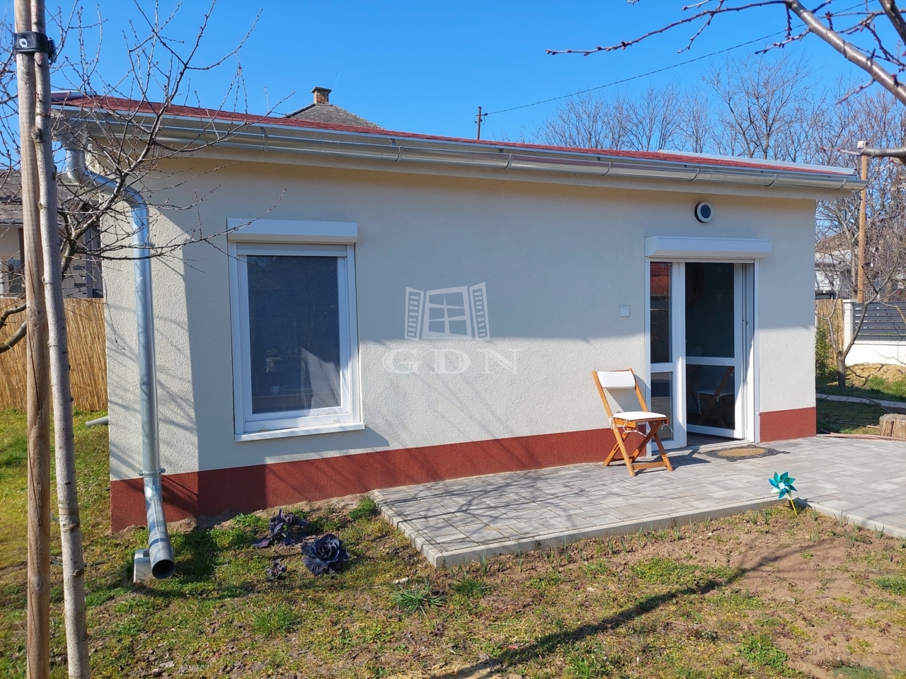 Az előkert részén helyezkedik el egy új kerti szerszámtároló, illetve itt lehet létrehozni egy kis konyhakertet is. A szépen gondozott hátsó kertben fiatal gyümölcsfák találhatók és ezen a területen, szükség esetén a ház további bővítése is lehetséges. A környék kifejezetten csendes, nyugodt kertvárosias. Bár az ingatlan előtt jelenleg még murvával borított út található, de a két szomszédos utca felől aszfaltozott úton közelíthető meg.